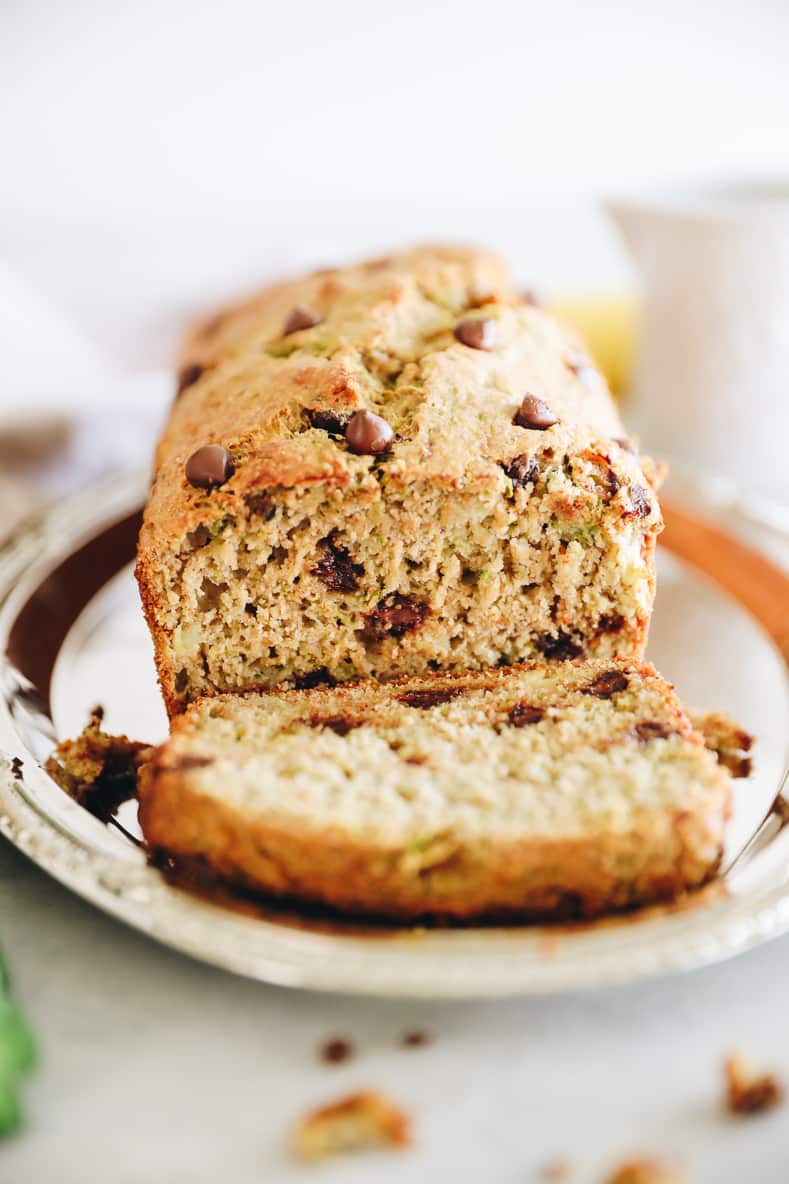 healthy zucchini bread sliced on a silver platter.
