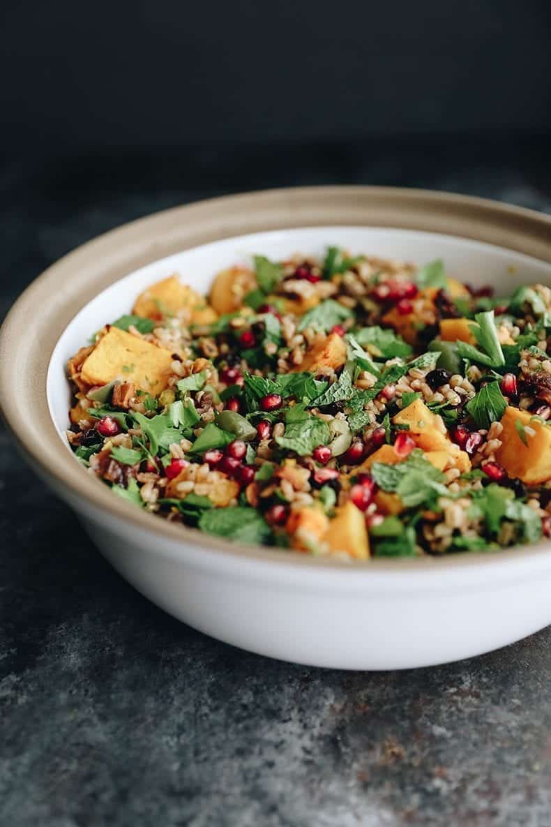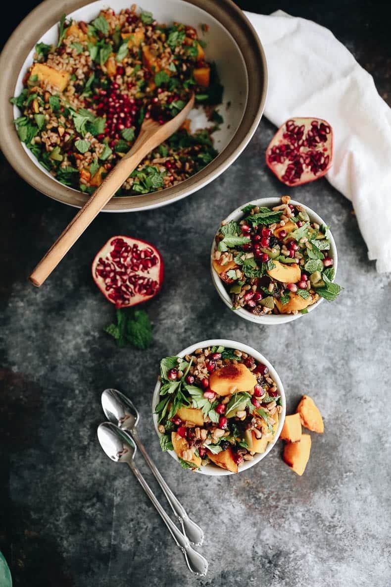 - Add cooked farro, roasted squash, pistachios, dates, currants, olives, pomegranate seeds and lemon zest to a big bowl. Add 1/3-1/2 of the dressing and toss to combine.