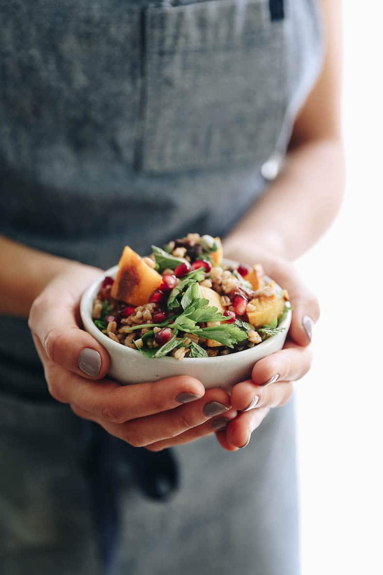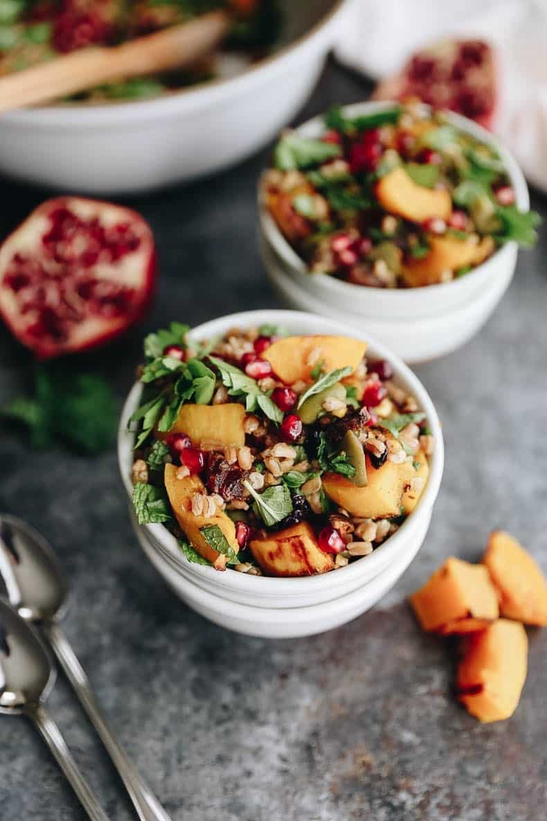 Get the best of fall with this Harvest Farro Salad with Roasted Butternut Squash and a Pomegranate Molasses Dressing. A seasonal favorite full of nutrition and delicious flavors for a side dish or main!