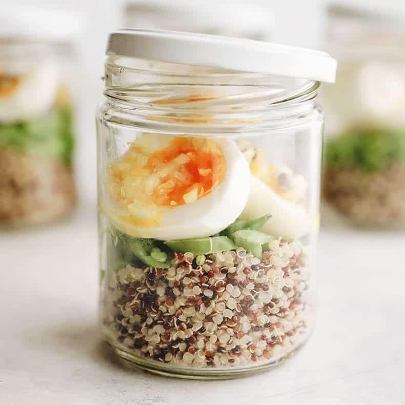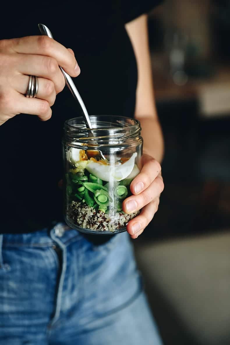 - To assemble the jars, place ⅓ cup quinoa in the bottom of the jar. Next add ¼ cup sliced snap peas. Place one of the eggs, cut in half, on top and spoon a few spoonfuls of the sauce over everything. Store in the fridge and eat over the next 4-5 days.
