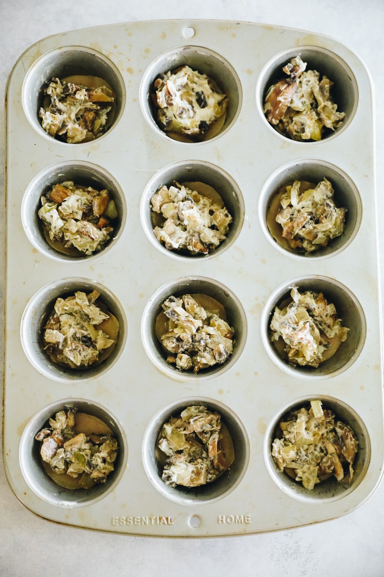 - Grease a muffin tin VERY well (and add optional parchment circles as shown above) and add roughly a tablespoon of the onion-mushroom mixture to all 12 cups.