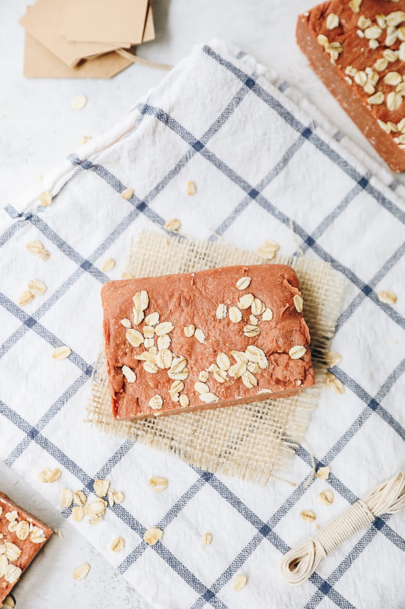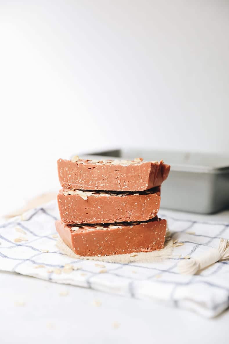 Pour your soap batter into your mold and smack against the counter a couple times to release any air bubbles. Top with rolled oats, if personal preference. Allow to sit for a few hours to harden (or place in the refrigerator for 1 hour if in a rush).