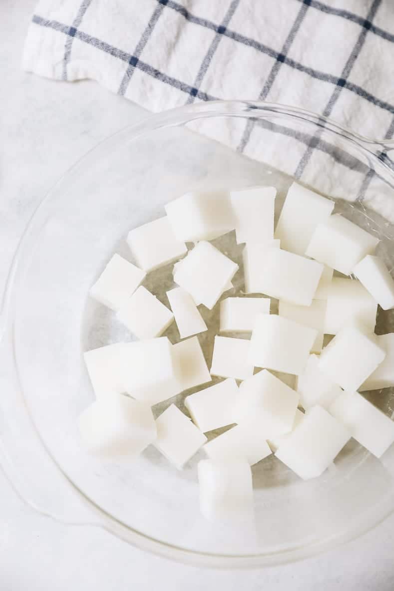 Gather and measure out all of your ingredients. Cut your melt + pour soap into small cubes (recipe calls for 1 lb which is half of a traditional 2 lb block). No need to measure, just estimate half. If you don’t have a silicone soap mold, line a loaf pan with parchment paper.