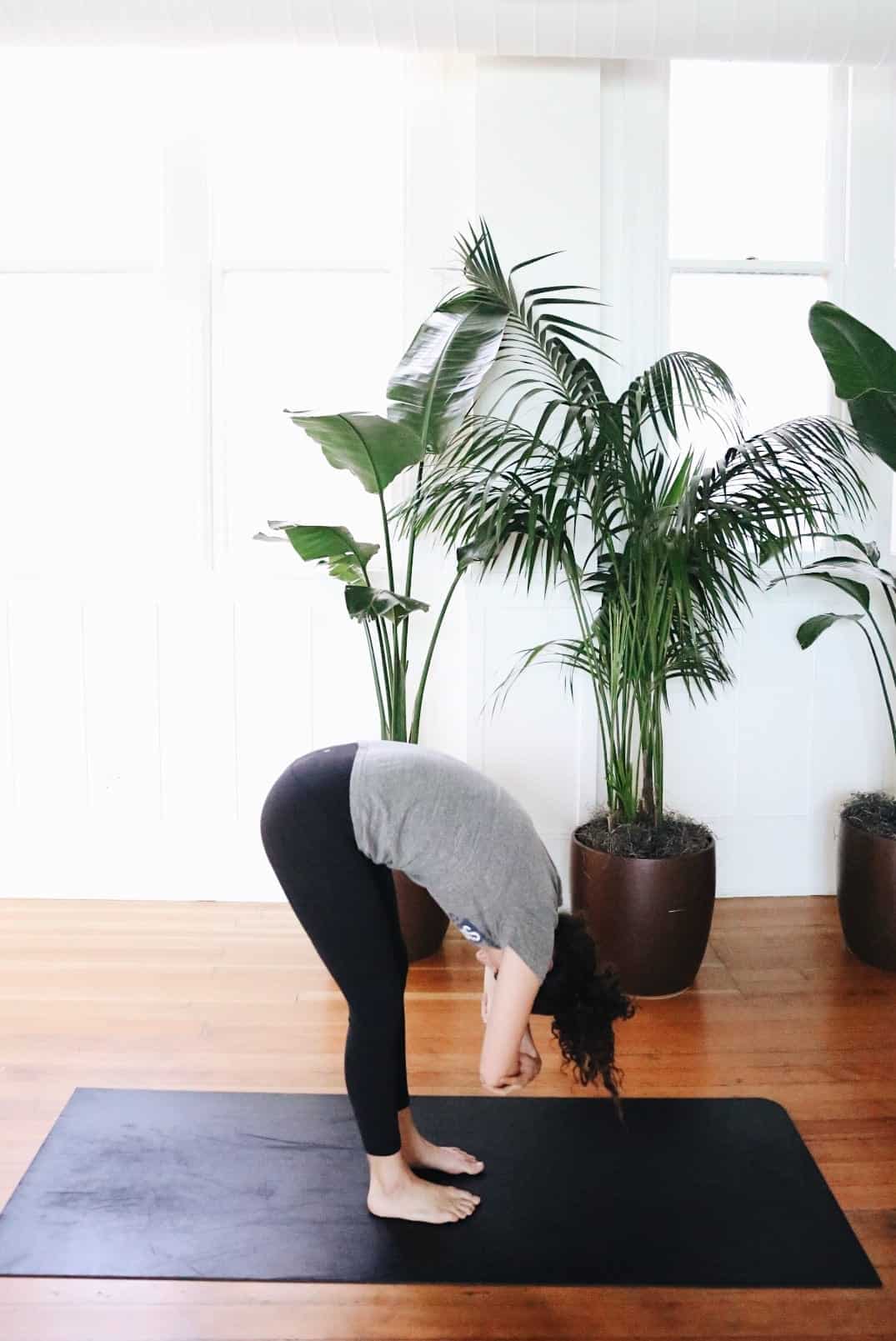 What it is: Forward fold is pretty straight-forward and accessible to most people. Start by standing hips distance apart and slowly roll down folding at your hips or if coming from cat/cow push up on your heels and walk your hands to your feet. Keep your knees as bent as you need and clasp opposite elbows to release the neck. Pull your heart towards your thighs and breathe for 10 breaths. Slowly release and roll up or walk forward into downward facing dog.