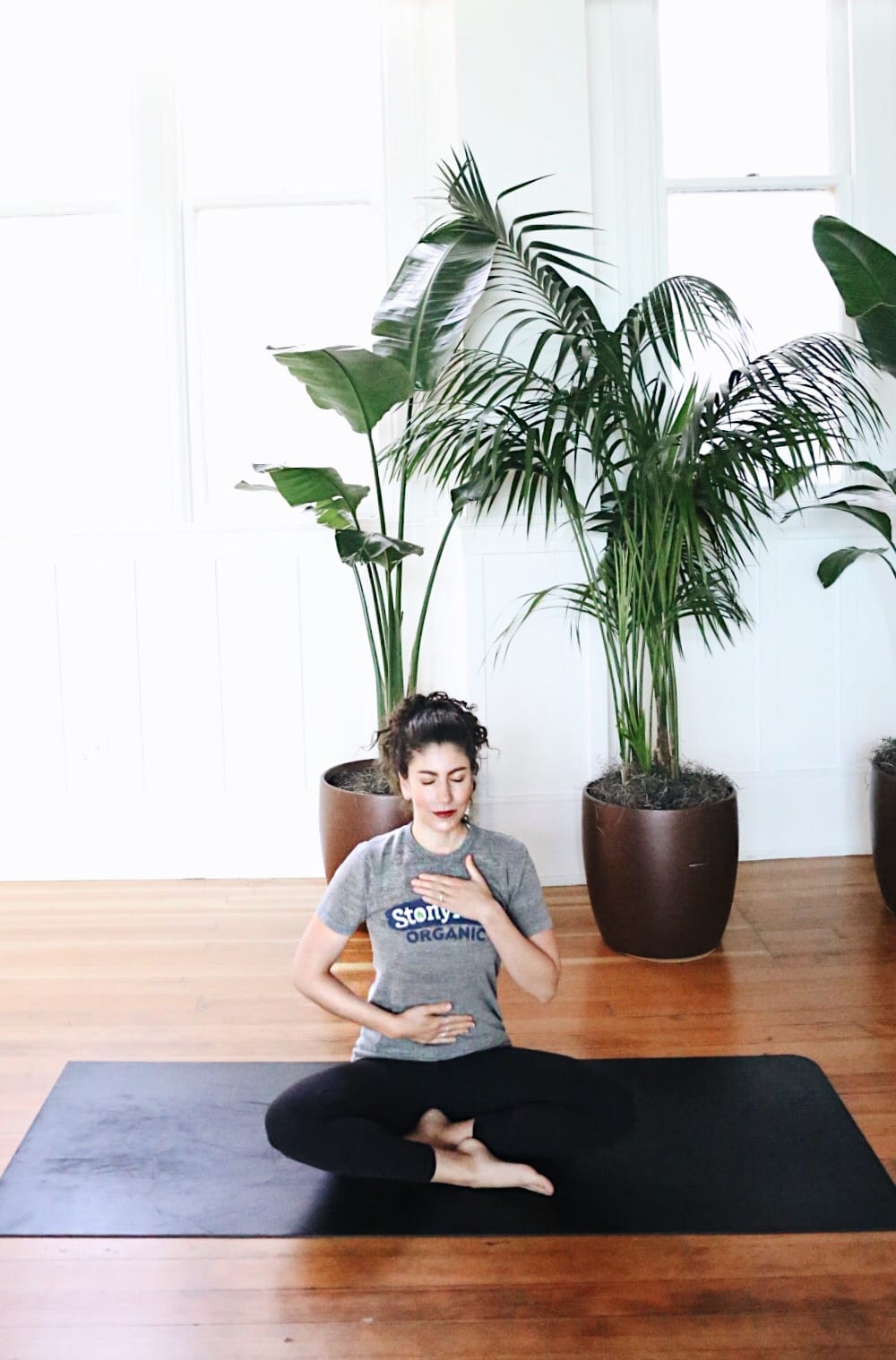 Start by sitting up tall, or laying down on your back. Close your eyes and place one hand on your belly and one hand on your heart. Take a deep breath in and then exhale everything through your mouth. Repeat x 3. Then breathe in for 3, hold at the top and then exhale to 4. Repeat x 10 or until you feel grounded. Place the emphasis on the exhale.