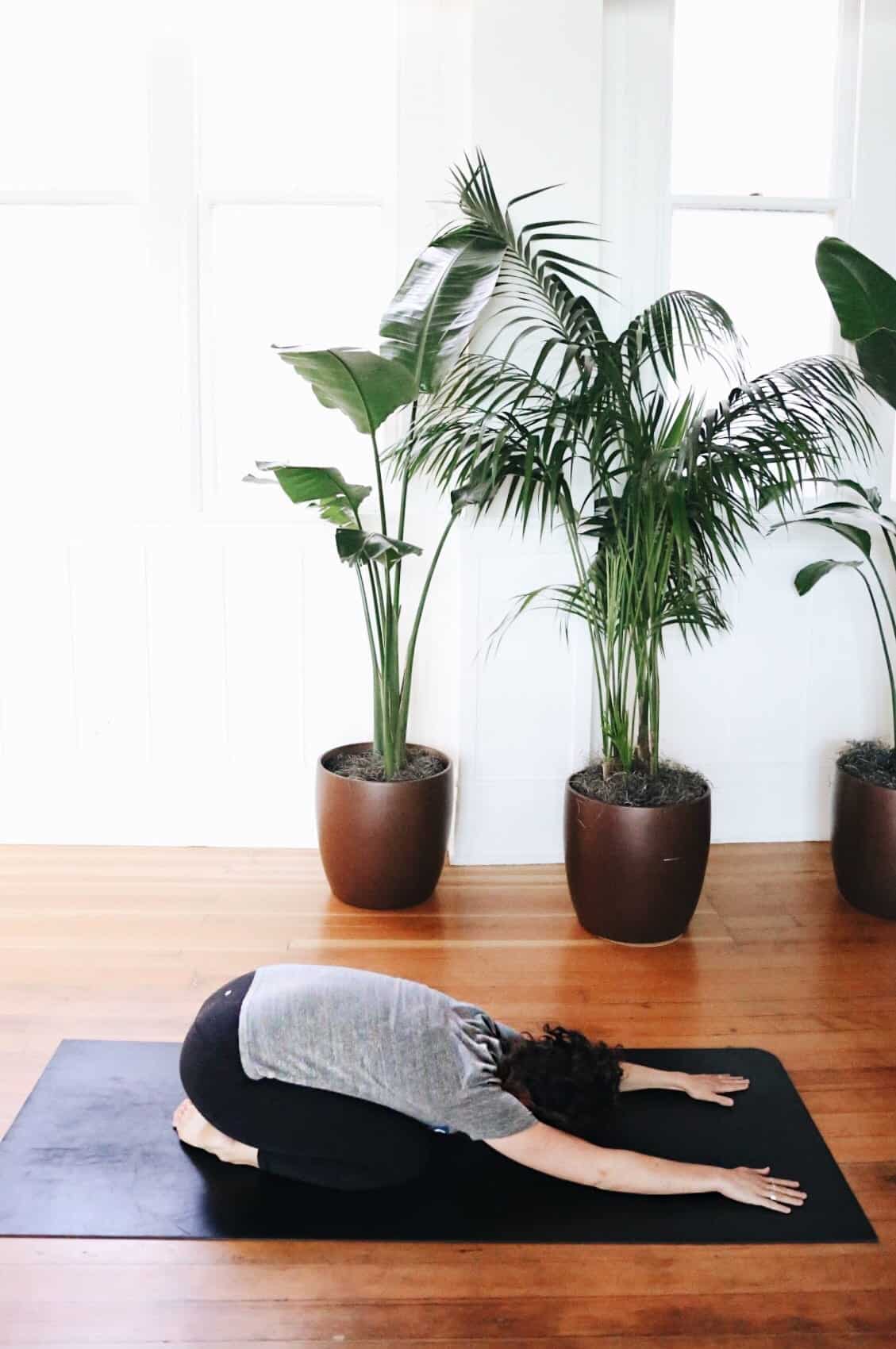 What it is: One of the classic resting postures, child’s pose is key feeling grounded in a yoga practice. On bent knees simply fold over with your arms in front of you laying flat on the floor. Sit back on your heels. Release your shoulders so they aren’t at your ears. Breathe for 10 breaths.
