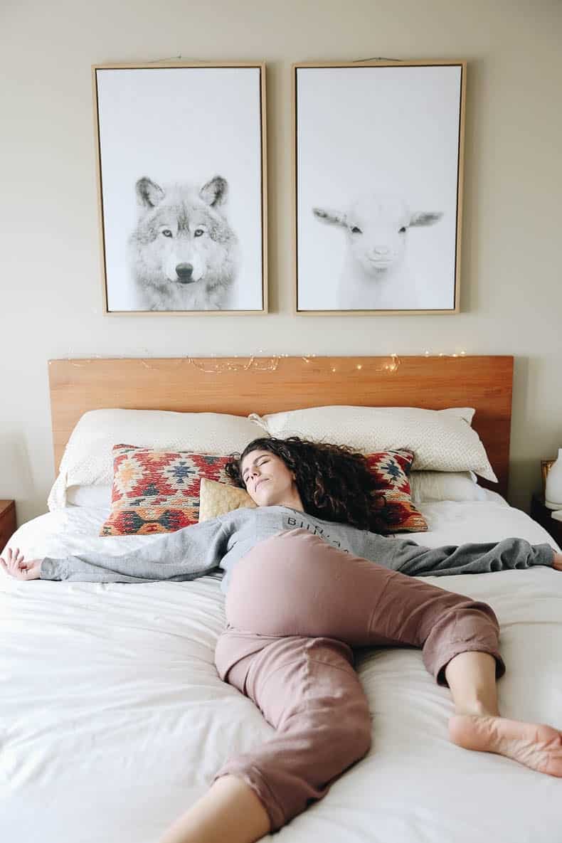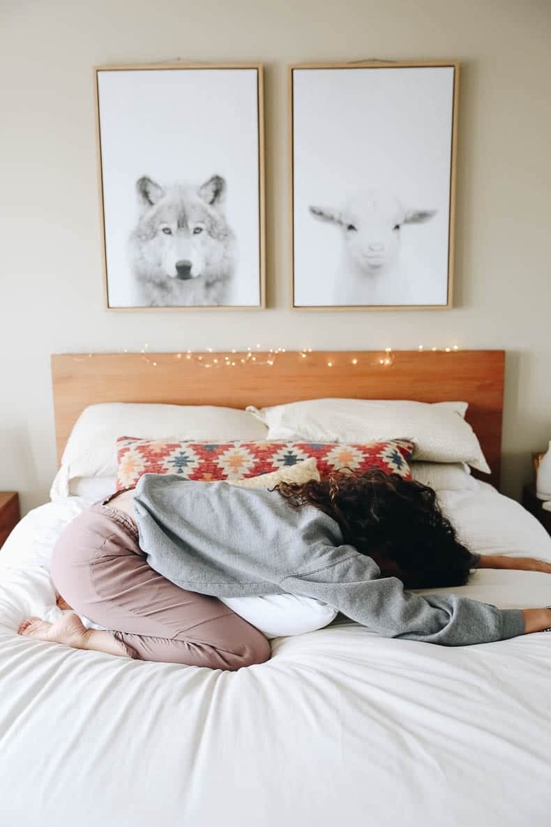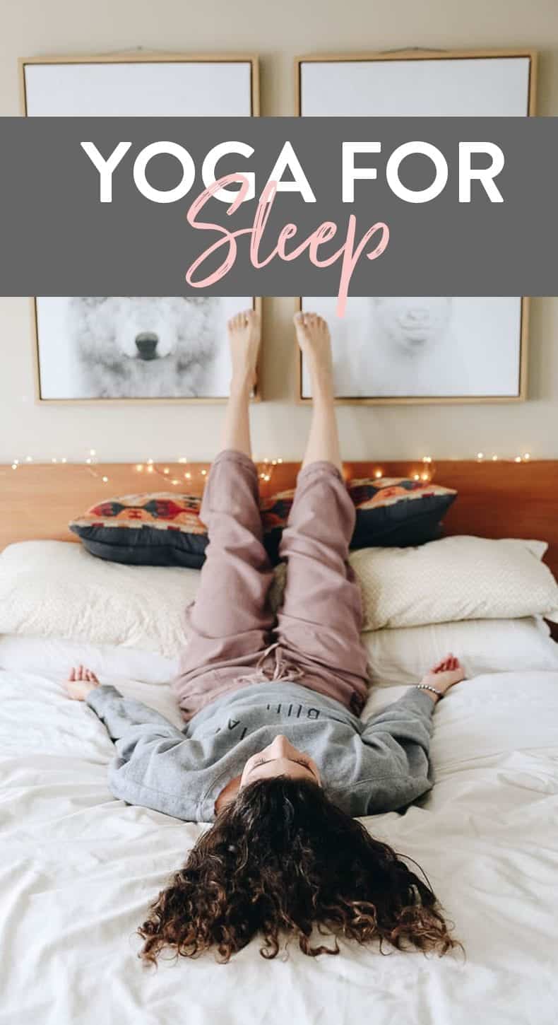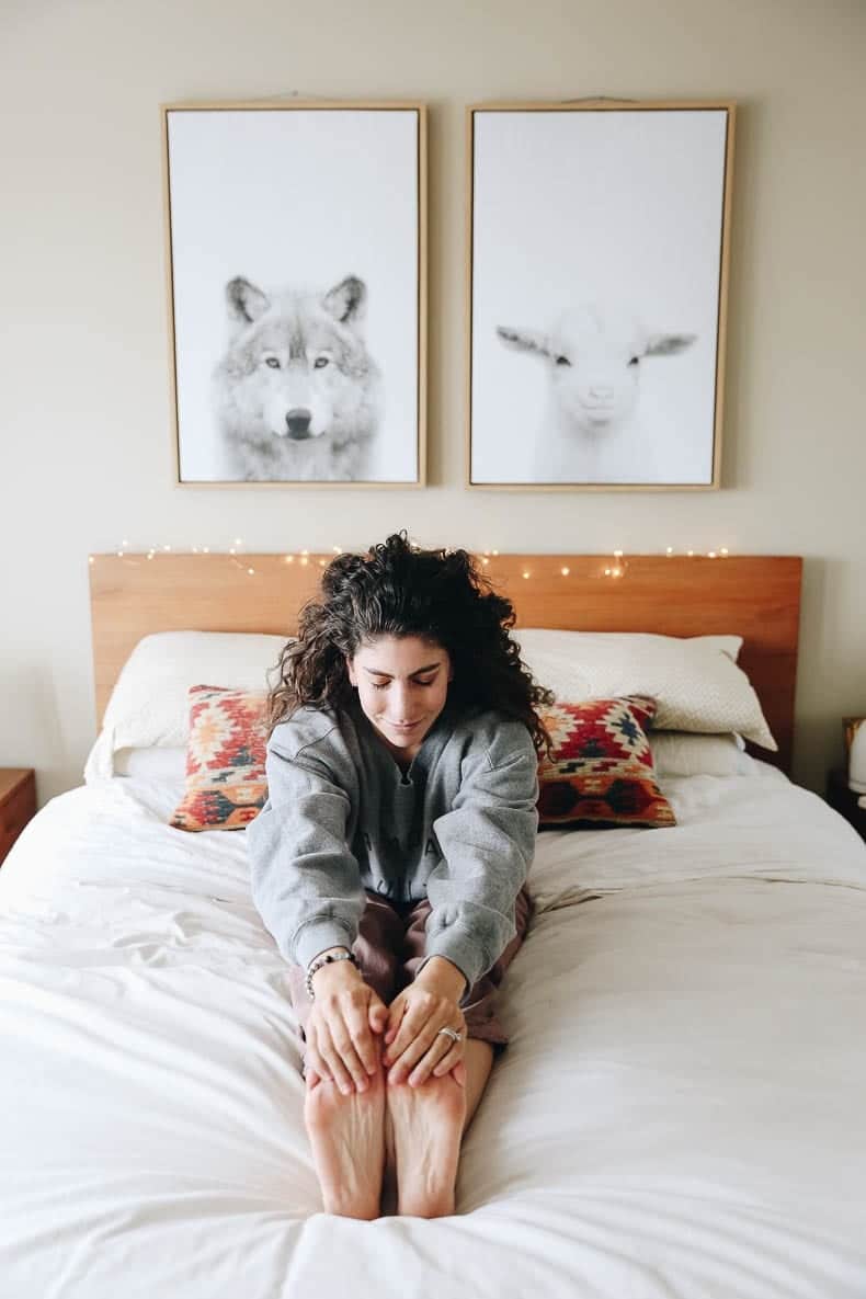 Before I jump into these yoga poses for sleep, I do want to mention a couple other ways you can help promote good sleep quality. Things like decreasing screen time, and using blue-light blocking lightbulbs and glasses can all be helpful. Having some kind of routine leading up to bedtime can help your body wind down from a long day and clear your mind before bed. There’s a misconception that bedtime begins when you go to sleep, but in actuality you should be setting aside at least 1 hour to start your bedtime routine. Maybe your routine consists of sipping on herbal tea, or reading a book. Maybe you do a face mask or meditate. Or maybe it’s a yoga for sleep flow! Whatever it is, try to keep some consistency to help train your body to know it’s bedtime.