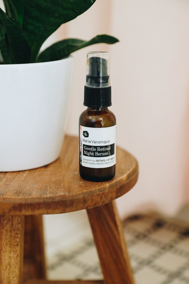 Now not all retinoid products are created equal. Besides the fact that many over-the-counter retinoid products contain other ingredients you may want to avoid in your natural skincare routine, they oftentimes contain a high strength of retinoid that can shock your skin when you start using it. You’ll want to look for something a bit more gentle to ease your way in. Sharing a bit more about Marie Veronique’s Gentle Retinol Serum and what makes it different: