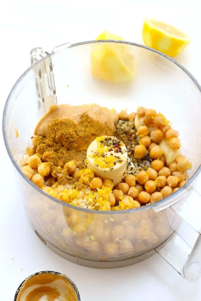 STEP 2: In a food processor, combine chickpeas, garlic, tahini, olive oil, lemon juice and zest. Process until combined. Add in the salt, pepper, cumin and hemp heart. Process until smooth.