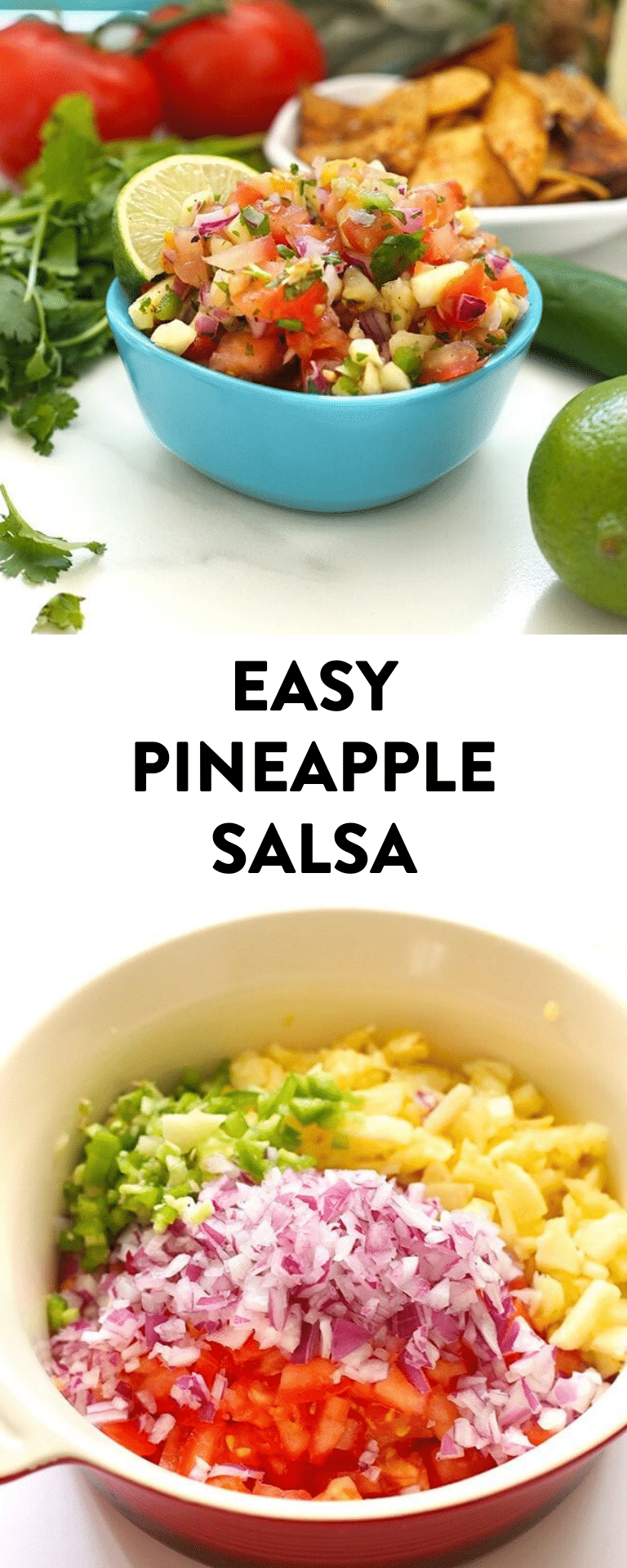 I’m making this recipe easy to follow for you guys with a step-by-step video! In it I will teach you how to make pineapple salsa as well as a tutorial on how to make homemade tortilla chips. Trust me – you’ll never go back to store-bought again!